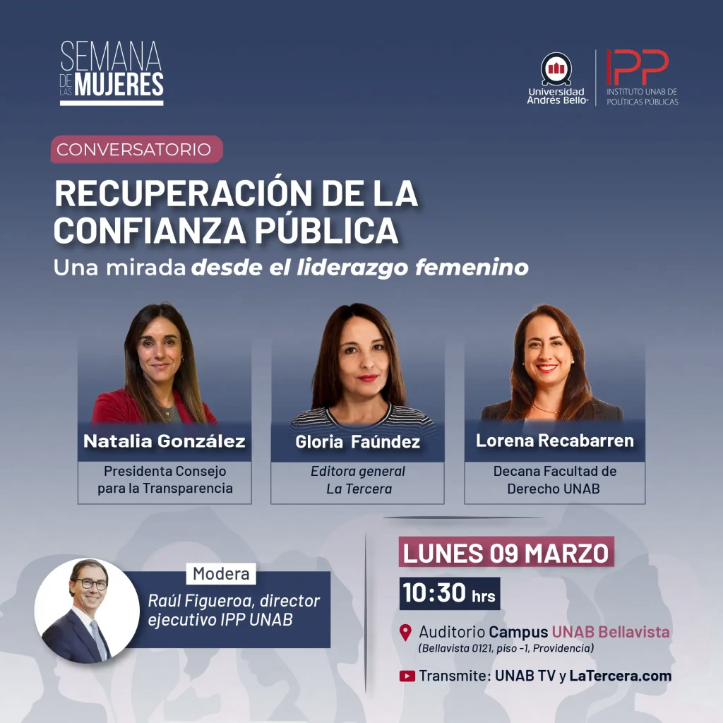 En el marco de la Semana de las Mujeres organizada por la Universidad Andrés Bello, el Instituto UNAB de Políticas Públicas realizó el conversatorio “Recuperación de la confianza pública: una mirada desde el liderazgo femenino”, instancia que busca reflexionar sobre la relevancia de una gestión pública sólida y ética para fortalecer la confianza institucional en Chile.